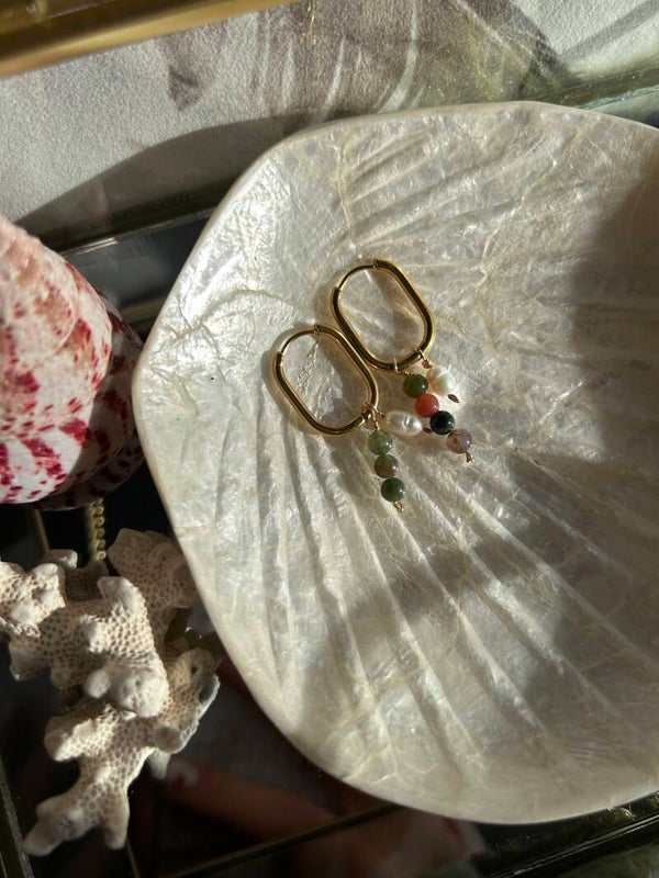 Deze oorbellen zijn gemaakt van stainless, indian agaat en zoet water parels. De rechthoekige oorbellen zijn gebruikt op de foto, ze zijn ook beschikbaar in het rond. De indian agaat hanger hebben beide 4 kralen.