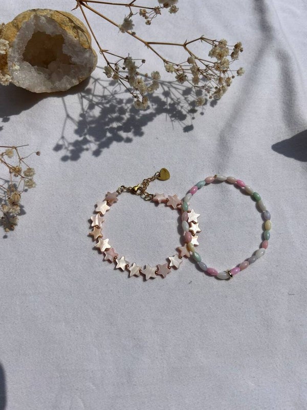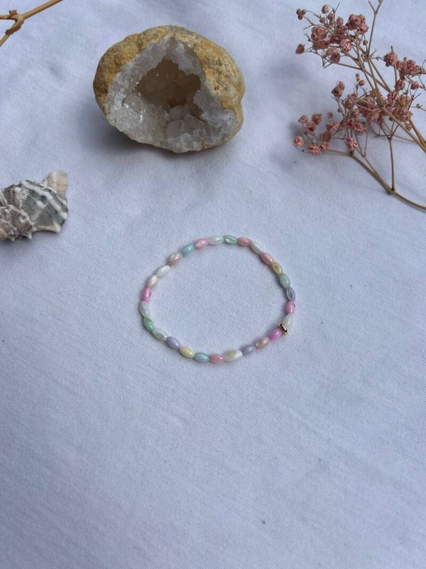 Deze lieve handgemaakte armband in pastelkleuren is een subtiele eyecatcher die je meteen doet denken aan zachte zomeravonden en suikerspinluchten. Gemaakt met glanzende schelp kralen in zachte tinten zoals lila, mint, geel en roze – perfect voor wie houdt van speelse sieraden met een dromerige touch.